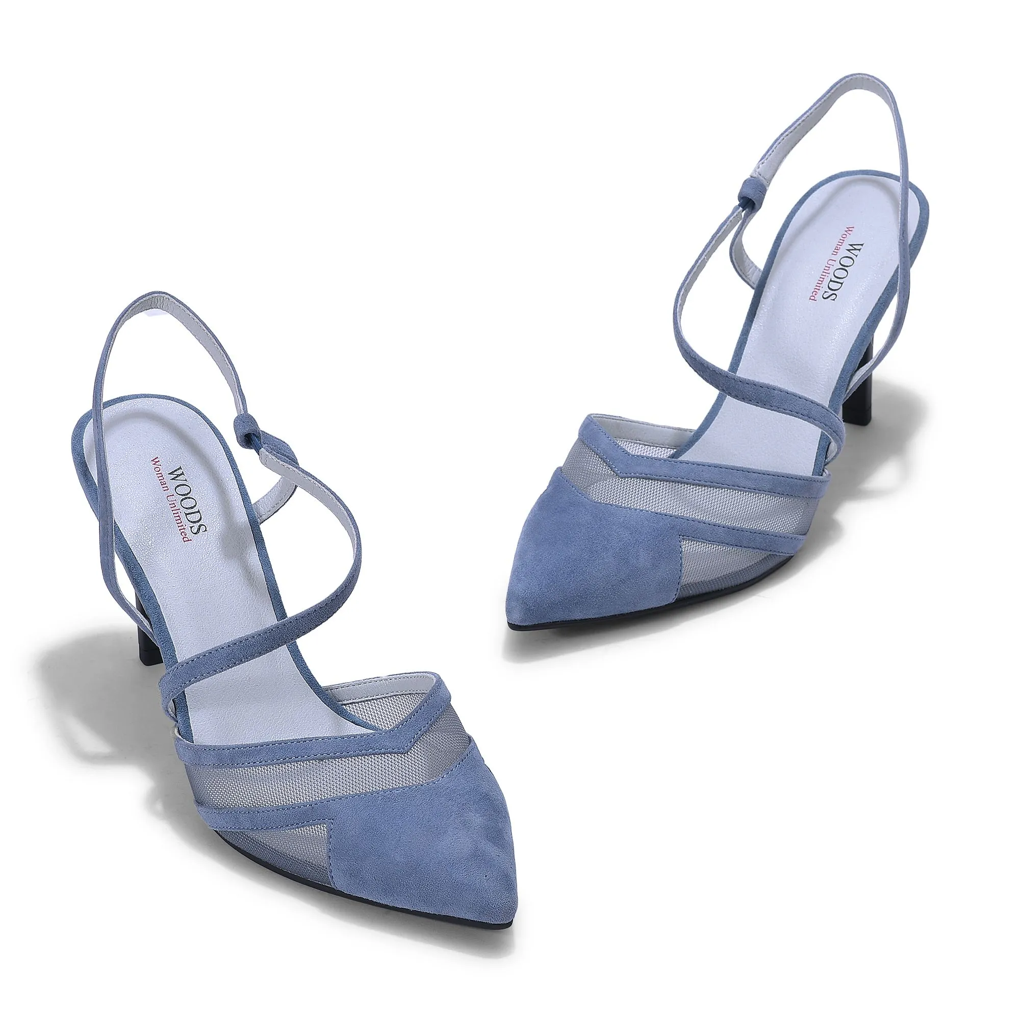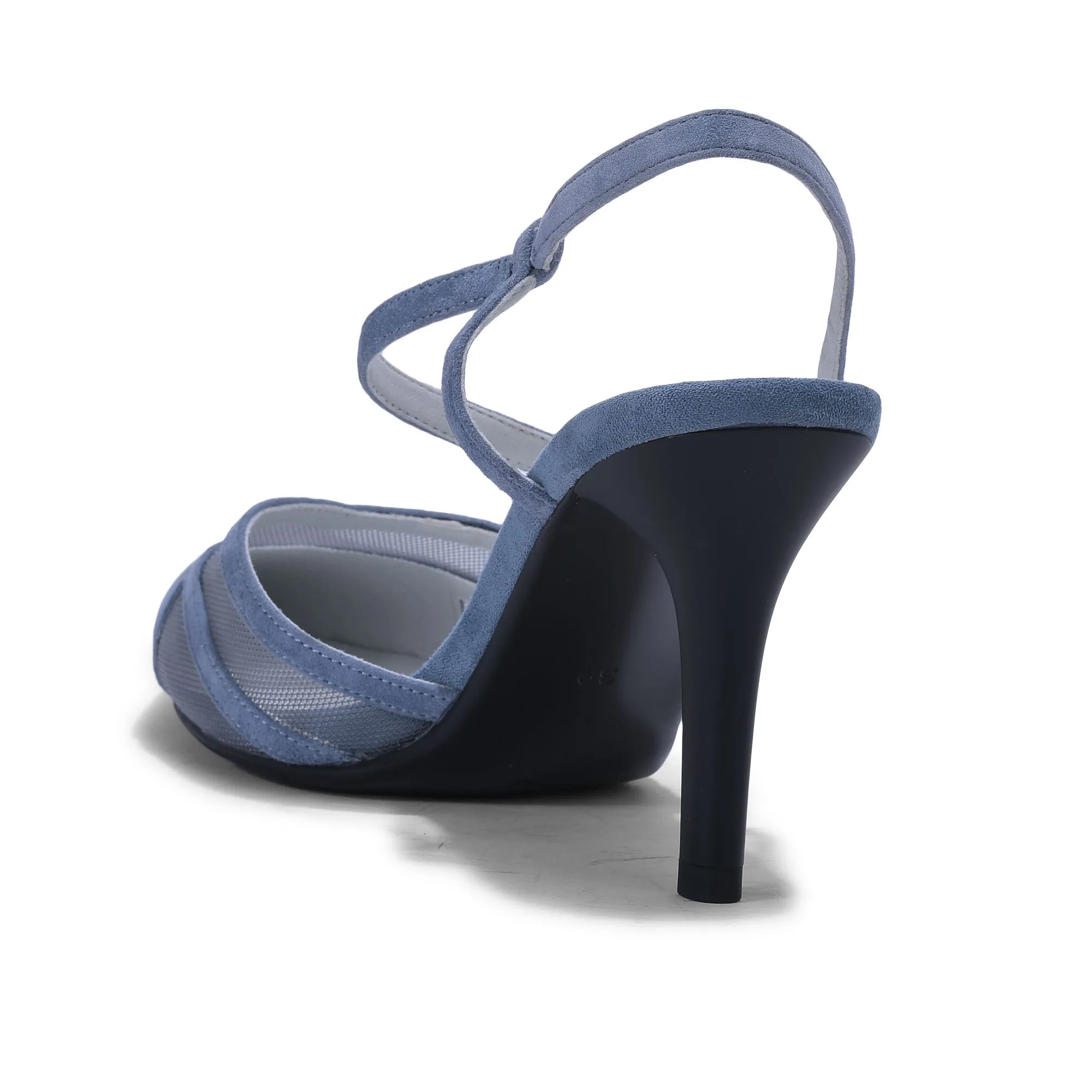 - Comfortable pair of pointed closed-toe sandal that is set on a high pointed heel. The dainty ankle straps add sophistication to the sandal. Built from luxurious suede construction the blue and light grey sandals come in net fabric detail construction.